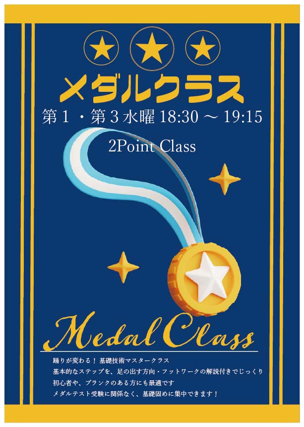 11月からスタートする「メダルクラス」!!踊りが変わる! 基礎技術マスタークラスメダルテストの基本的なステップを、足の出す方向・フットワークの解説付きでじっくり踊っていきますまったくの初心者や、ブランクのある方にも最適ですメダルテスト受験に関係なく、基礎固めに集中できます!